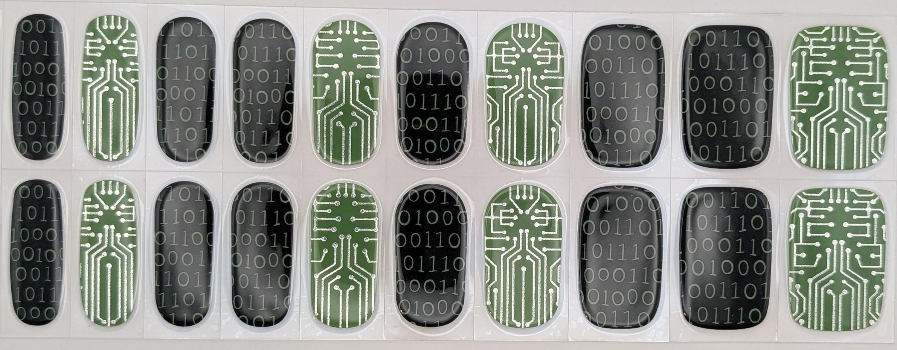 Bit By Bit UV semi-cured gel nail wraps bring geeky glamour straight to your fingertips. These nails were inspired by green circuit boards and binary numbers. When was the last time you did some binary math?