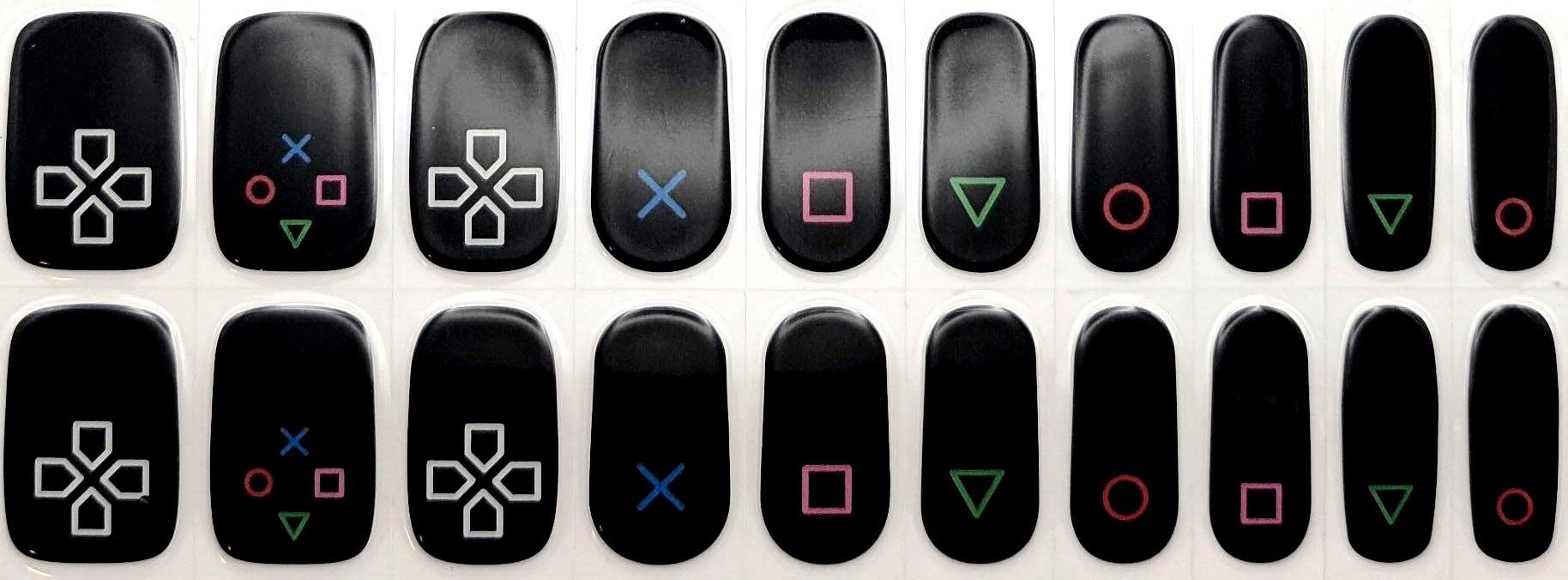 Show off these PlayStation inspired nails the next time you play. These UV gel nail wraps feature a black background with the various controller icons - circles, triangles, and the controller pad.