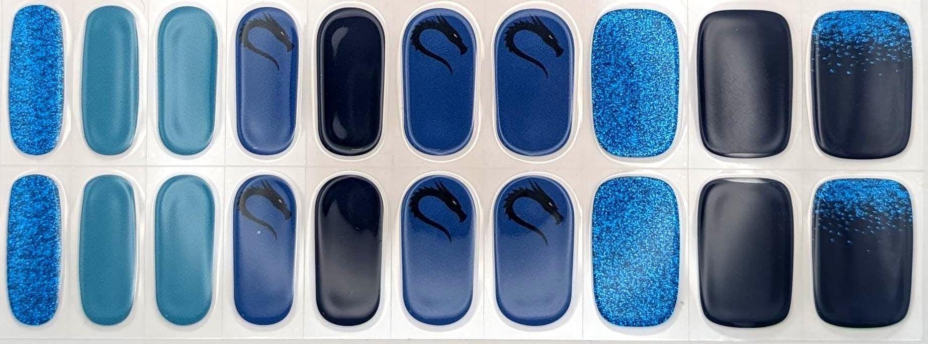 These UV gel nail wraps feature a cute dragon, light blue glitter, solid dark blue, and various blue tones inspired by Kali Linux. Perfect for those who code by day and command attention by night.