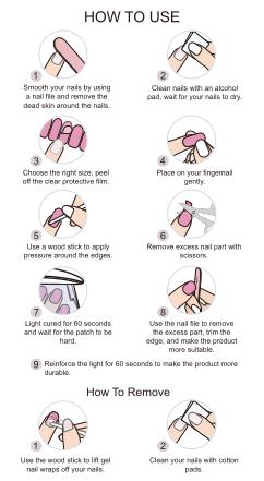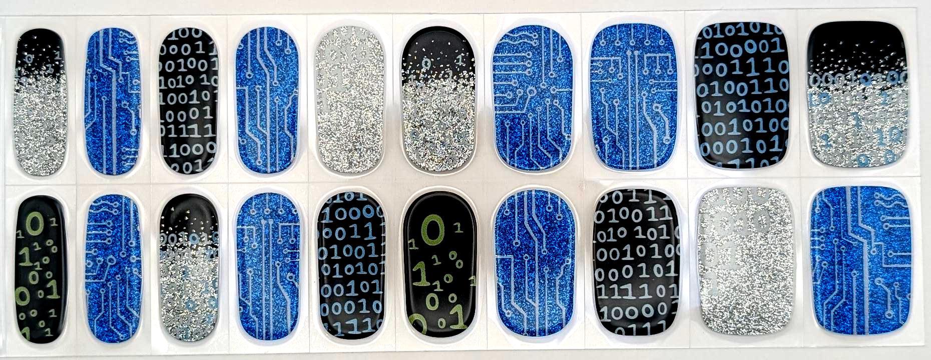 These fun and playful nails feature fun glitter blue with circuit boards, and black nails with various 1 and 0 - binary - designs. The package includes 20 wraps, an orange cuticle stick, and an alcohol wipe.