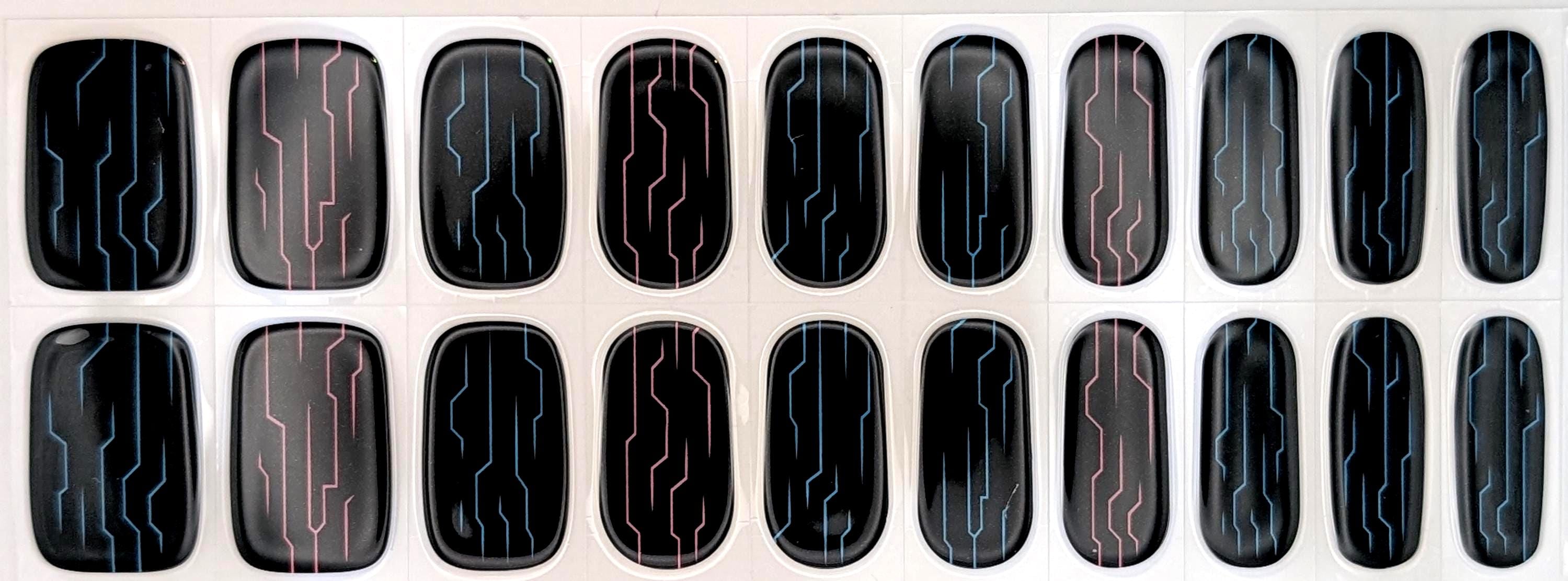 Enter the digital frontier with these cyberpunk semi-cured gel nail strips straight out of the mainframe. Featuring sleek circuit pathways in electric cyan and hot pink against a glossy black, this design captures the iconic Tron aesthetic with flowing neon lines.