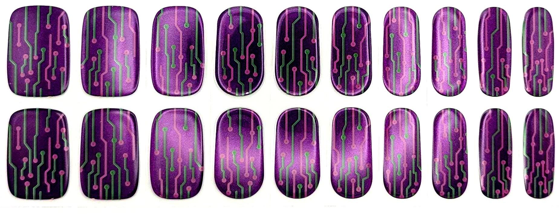 These semi-cured UV gel nail strips feature intricate circuit board traces in vibrant green and pink against a stunning metallic purple background that shifts and shimmers.