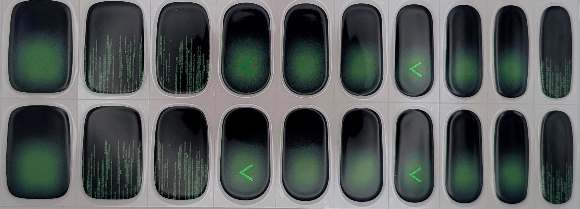 These matrix inspired, cyberpunk semi-cured UV gel nail strips feature cascading digital rain code in signature neon green against deep black, paired with green gradient nails that glow like phosphorescent terminals.